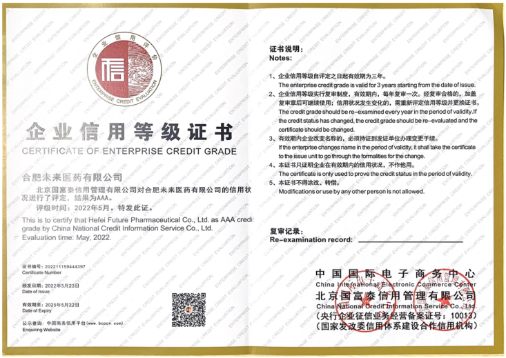 为响应商务部和国资委推行的行业信用等级评价工作,经中国国际电子商务中心和北京国富泰信用管理有限公司权威机构认证,合肥未来医药有限公司于2022年5月荣获企业信用评价AAA级信用企业,并颁发了企业信用等级证书。标志着我司在规范运营、诚信经营上得到了国家相关部门及权威机构的认可。